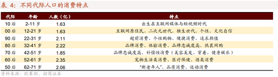 路径一:需求效应。主要体现在三点:(1)个人消费随生命周期变化,不同生命阶段的人消费能力与需求不同。(2)不同世代的人成长的时代不同,消费观念存在巨大差异。(3)收入增长引起的消费升级。这三点将分别对应未来我国老龄消费需求的上升、Z世代消费能力爆发以及消费升级现象的出现。