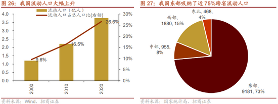 流动人口比例不断上升,且东部地区吸纳近75%跨省流动人口。2020年我国流动人口3.76亿人,占总人口比例为26.6%,10年间增长了将近70%。从流向上看,人口持续向沿江、沿海地区和内地城区集聚,长三角、珠三角、成渝城市群等主要城市群的人口增长迅速,集聚度加大。从四大地区来看,东部地区吸纳跨省流动人口9181万人,占比达到73.54%,中部地区吸纳955万人,占比是7.65%。西部地区吸纳1880万人,占比15.06%,东北地区吸纳468万人,占比3.75%。