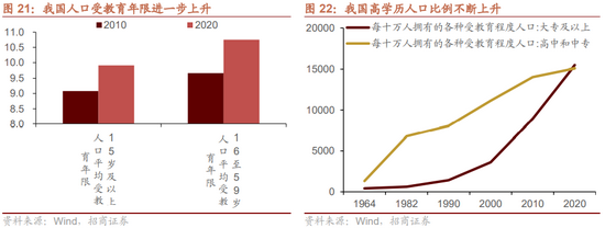 近十年我国人口平均受教育年限进一步上升,劳动力素质提升较快。从受教育年限看,根据七普数据,我国15岁及以上人口的平均受教育年限为9.91年,比2010年提高0.83年。其中,16-59岁劳动年龄人口平均受教育年限达到了10.75年,比2010年的9.67年提高了1.08年。