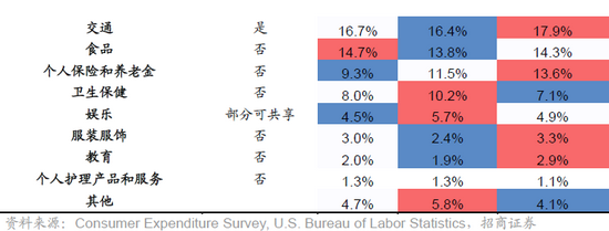 (1)小型家庭对非共享型支出的人均消费更大。以美国为例,单身家庭的住房消费支出比例大于两人家庭,有娃家庭则更小。类似的消费还有家电、家居、汽车及部分电子娱乐产品。有娃家庭则在食品、交通(除购买汽车支出)、服饰、教育上支出比例更大。