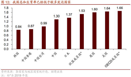 育龄妇女人数下降以及生育意愿降低是少子化的核心原因。根据国家统计局抽样数据测算,我国育龄妇女人数在2011年达到峰值3.8亿人,其后快速下降。2020年,我国育龄妇女约3.4亿人。另一方面,我国妇女的总和生育率下降至1.3,显示出妇女生育意愿的大幅下降。总和生育率(total fertility rate,简称TFR)是该国家或地区的妇女在育龄期间,每个妇女平均的生育子女数。理论上,要保证人口相对于上一代不增也不减,一对夫妇只需生2个孩子。但是由于部分小孩会夭折,且正常出生性别比不对称,因此总和生育率应该高于2.0才能维持人口的世代更替。当前,我国总和生育率已经低于美国、日本、德国等发达国家水平,少子化问题非常突出。
