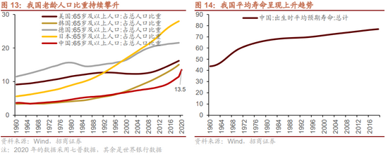 我国老龄人口规模较大,且老龄化进程明显加快。七普数据显示,我国60岁及以上人口2.6亿人,占总人口的18.7%,其中65岁及以上人口1.9亿人,占总人口的13.5%,老龄人口规模较大,老龄化现象突出。2010年-2020年,60岁及以上人口比重上升了5.44%,65岁及以上人口上升了4.63%。与上个10年相比,上升幅度分别提高了2.51%和2.72%,随着人均寿命的增长以及第一波婴儿潮人口步入老年,我国人口老龄化的进程加快。