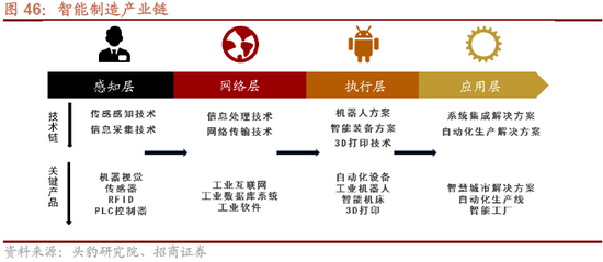 从产业链角度来看,智能制造主要涉及四大环节,分别是感知、决策、执行、应用。具体涉及的细分领域包括:感知层的传感器、机器视觉、射频器件以及PLC控制器负责采集信息。各类传感器将会把采集的信息上传至决策层进行数据的储存与处理,因此决策层主要涉及工业互联网平台、数据库系统以及工业软件。当软件与平台根据信息输出应该执行的结果后,由执行层的终端来负责进行操作,执行层的设备主要是工业机器人、数控机床、3D打印设备以及其他自动化设备。这一过程最终将应用到智能工厂、自动化生产线的日常运作之中,从而实现智能制造。