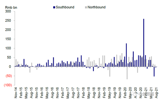 2)从外部来看,7月份FOMC会议纪要导致市场担心美联储QE减量渐行渐近。虽然我们认为此次FOMC会议纪要与三周前的FOMC会议相比并未出现新的变化,但包括A股和港股在内的全球市场依然受此影响而波动。实际上,A股市场特别是成长板块因为其相对更好的估值,受这一因素的影响可能更大,表现为北向资金在上周四和上周五连续两天大幅流出(每天流出总量超过100亿元),而上次相似的连续两天大举流出是在2015年7月。另外,南向资金本周也再度转为流出,其中腾讯、药明生物、美团和中芯国际的流出规模较大。