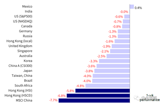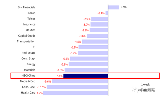 MSCI中国指数上周大幅下跌7.7%;医疗保健和可选消费板块表现落后