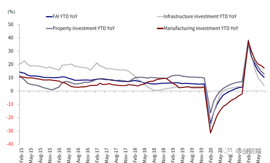 1)宏观:7月份经济数据弱于预期,除了受到短期因素影响以外,也进一步证实经济增速出现放缓。1)7月份工业增加值同比增长6.4%,明显低于7.9%的市场一致预测;7月份工业增加值两年期年均复合增速与6月份相比下降0.9百分点,降至5.6%。在0.9个百分点的降幅中,限产与拉闸限电带可能贡献了0.4个百分点,而此前高速增长的行业增长均值回归可能贡献了0.3个百分点。2)1-7月份固定资产投资增长10.3%,受基建投资放缓影响,7月份两年期年均复合增速环比下降2.9个百分点至2.8%。房地产方面,7月份销售面积两年期年均复合增速从6月份的5.3%放缓至-0.3%。3)7月份社会消费品零售总额同比增长8.5%,两年期年均复合增速3.6%,与6月份相比放缓1.3个百分点,主要是受疫情反弹以及洪涝灾害影响。