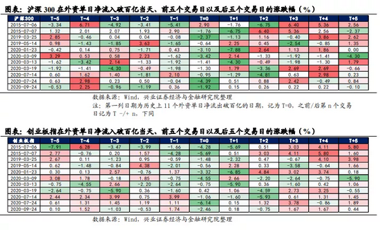 (2)外资单日的大规模流出对市场的负面影响是短暂的,市场往往快速自我纠正,在之后的几个交易日内大概率可以重回上行通道,其中,创业板指在外资撤出超百亿后的第4、5个交易日后上涨的概率高达73%、82%。