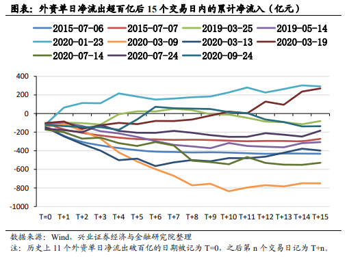 最后,通过观察了过去11次外资净流出破百亿后15个交易日内的流出模式,我们发现: