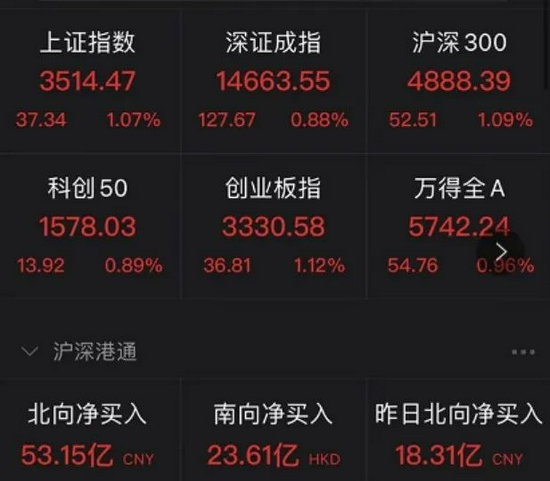 截至收盘,三大股指集体上涨,沪指、创业板指均涨超1%。两市成交额超1.4万亿元,连续第25个交易日破万亿元。北向资金净流入53.15亿元。