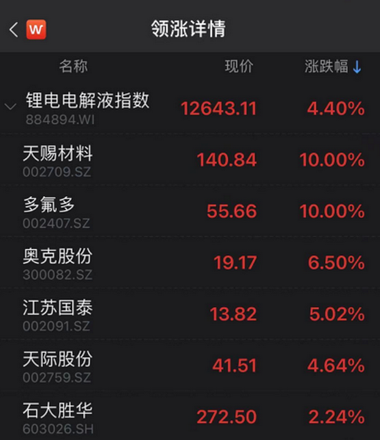 正极、负极、电解液、隔膜是锂电中游的四大关键材料。今日电解液、正极板块涨幅居前。Wind锂电电解液板块指数上涨4.4%,除天赐材料外,多氟多也涨停。