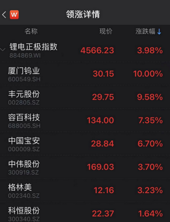 Wind锂电正极板块指数上涨3.98%,板块中厦门钨业涨停。