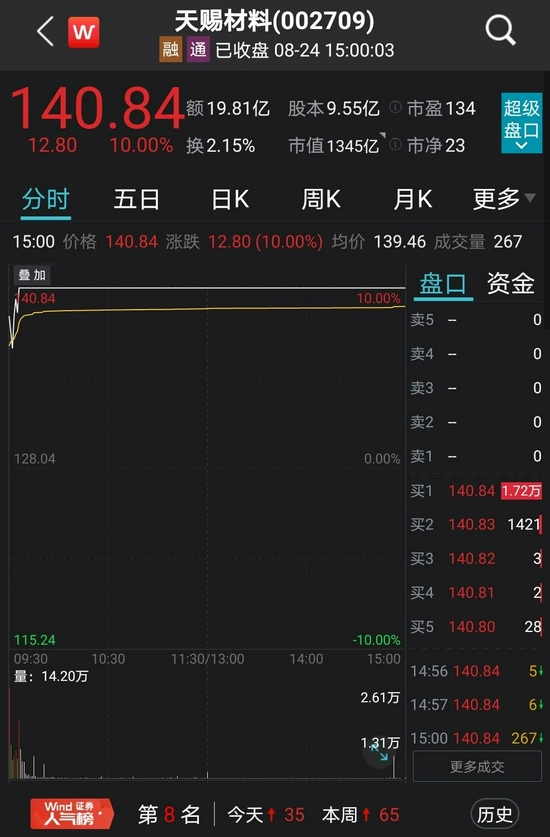 天赐材料今日高开后迅速涨停,收盘报140.84元,创出历史新高,最新总市值为1345亿元。