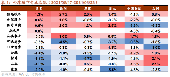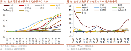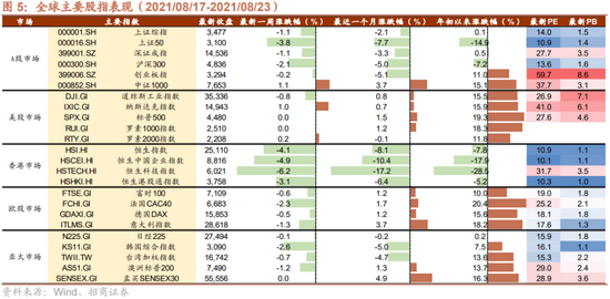 上周全球股市下跌。美股方面,道指下跌0.8%,纳指上涨1.0%,标普500与上周持平。市场主要关注美国经济数据、美联储议息会议纪要以及全球疫情与疫苗接种。经济数据方面,美国劳工部报告称,美国截至8月14日初请失业金人数为34.8万人,远低于道琼斯公司预计的36.5万人,较前一周减少了2.9万人,创下了疫情爆发以来的新低,显示就业市场在进入秋季前正在逐步改善。IHS Markit数据显示,美国8月PMI从上月的59.9降至55.4,为近8个月来的最低值,自5月达到创纪录的68.7之后每月都在下降。美联储议息会议纪要方面,周三公布的会议纪要中,决策者在7月议息会议上详细讨论了今年开始缩减购债规模的可能性,不过对于具体何时进行taper仍存在分歧。美联储重申应该先Taper,直到资产负债表不再扩张,然后再加息,认为目前还未达到加息所需的就业方面标准。大部分与会者认定,在充分就业的目标方面,还未达到FOMC委员会所说的取得“实质性进一步进展”,在价格稳定的目标方面,则已取得一定进展。全球疫情方面,当前,欧美国家疫苗接种比例快速上升,其中德法英美四国疫苗完全接种的人口比例分别为58.32%、54.54%、61.41%、51.08%。但是,由于德尔塔变种病毒迅速传播等原因,美国新冠疫情形势严峻。美国计划从9月20日起开打新冠疫苗加强剂。然而,在全球数以亿计的人口尚未接种一剂疫苗的当下,世卫组织对于美国等富裕国家急于为国民提供追加剂提出批评。世卫组织专家称,没有足够的科学证据表明这些国家需要展开追加接种计划,并指此为不道德之举。上周新增病例数较高的国家为美国、伊朗、英国、西班牙、乌干达等。