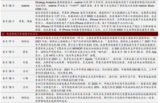 3、人工智能:美国太平洋时间8月19日,特斯拉在帕罗奥图总部召开AI日,发布AI训练Dojo D1芯片和训练机器Dojo,以及特斯拉Bot的蓝图。特斯拉的AI日上最受关注的环节便是公开了“道场”(Dojo)超级计算机系统中的D1芯片,展现了电动车巨头在机器学习硬件方面的卓越实力。上周百度世界大会展示了百度人工智能(AI)在出行、生活、产业及自主创新科技等领域的最新成果和应用,正式发布了Apollo“汽车机器人”。人工智能作为新一轮技术革命当中的重要一环,正在实践中不断催化出科技创新成果。建议关注AI领域投资机会。