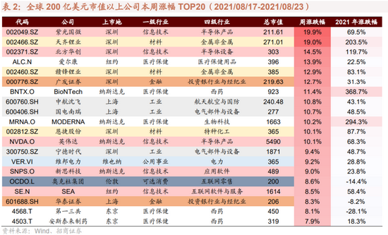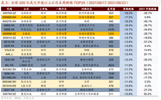 过去一周大涨的200亿美元以上市值公司中,信息技术、医疗保健板块公司相对较多。过去一周领跌的200亿美元以上公司中,可选消费板块公司居多。