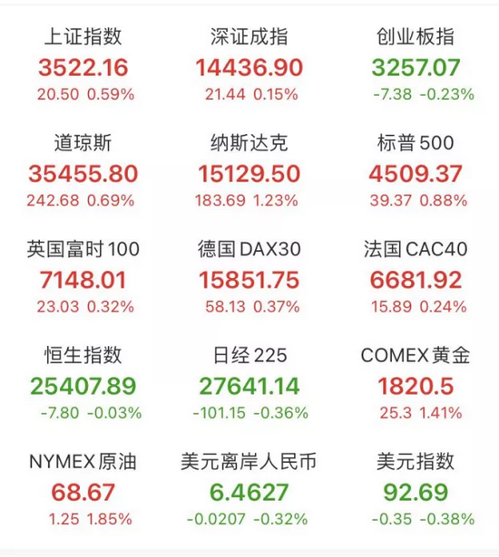 海外市场:美国三大股指全线上涨,标普500指数和纳指续创历史新高。道指涨0.69%报35455.8点,标普500指数涨0.88%报4509.37点,纳指涨1.23%报15129.5点。本周,道指涨0.96%,标普500指数涨1.52%,纳指涨2.82%。值得关注的是,颓废近半年之久的中概股近期出现大幅反弹,数据显示,美国散户对中概股的一周购买量创下了5年来最高水平,其中对阿里巴巴的流入量最大。
