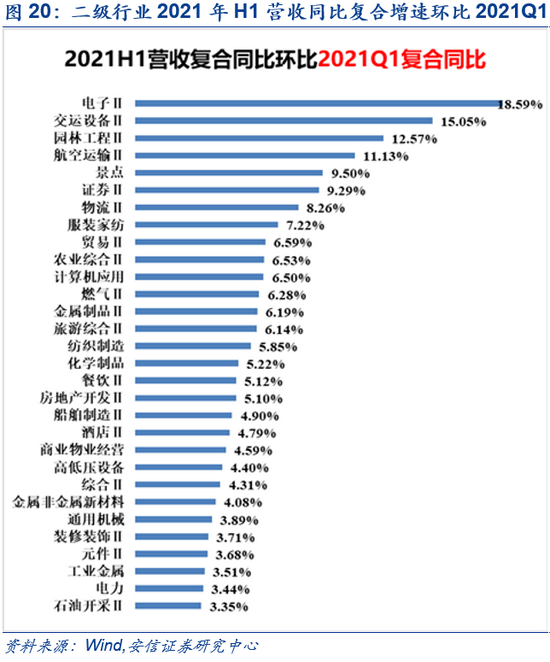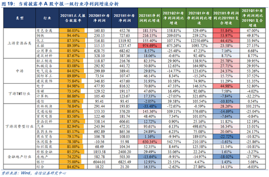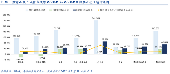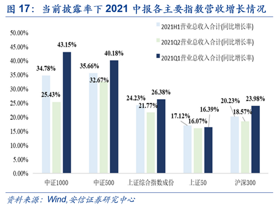 中报层面A股年化利润增速进一步提升,中小盘成长基本面占优,科创板增长最为强劲,我们认为下半年A股基本面将好于市场预期。截至8月29日早10时,全A共披露3708家,披露率83.27%。从整体来看,约75%的披露公司较2020年同期同比增长为正,约55%公司的披露公司较2019年复合增长为正,呈现较强的盈利弹性。从目前披露的中报业绩数据来看,2021H1全A归母净利润同比增速在40%左右,同比2019H1复合增长9.06%;H1全A(非金融石油石化)在55%左右,同比2019H1复合增长15.99%,同口径下环比2021Q1复合增长小幅上行,符合我们对此前从A股归母净利润年化同比增速大概率在二季度的判断。从板块数据来看,科创板业绩增长明显,中小盘成长基本面占优,中证1000和中证500指数成分股中报利润增速均在60%以上,尤其是中证500在Q2单季度增速仍然维持在50%左右,较同期沪深300明显占优。从下半年A股基本面来看,我们依然认为将会好于市场预期。从工业企业数据来看,1—7月份规模以上工业企业利润同比增长57.3%,两年平均增长20.2%,环比上半年基本保持平稳。7月份单月同比增长16.4%,两年平均增长18.0%(以2019年同期数为基数,采用几何平均方法计算),比6月份加快2.3个百分点。
