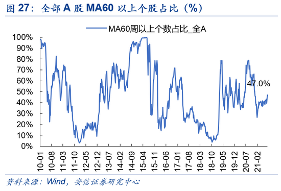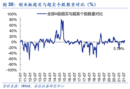 本周市场反弹,周期、中小盘板块表现较优。当前市场强势个股数量占比47.2%,较前一周大幅回升3.8个百点;超买个股与超卖个股之差占比5.8%,较前周大幅回升4.6个百分点。创业板来看,强势个股数量占比49.5%,较前一周回升1.5个百分点;超买个股与超卖个股之差占比5.4%,较前周回升1.8个百分点。