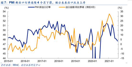 我们此前的第二个重要判断是7月之后中国经济下行压力将逐步显性化,货币政策维持中性偏宽松基调,下半年流动性无忧。近几周以来,中国经济复苏动能减退已成为市场共识,投资不足、中小企业压力较大、上游对中下游利润挤压和消费不足的结构性矛盾进一步凸显。7月工业增加值和社零数据明显回落,BCI指数连续5个月下滑,反映出当前经济需求不足且企业经营状况趋于恶化。PMI新出口订单连续4个月下滑,预示未来出口压力或将上升。