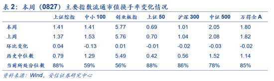 本周市场交易热度小幅回落,但仍处相对高位。本周上证综指,中小100,创业板指,上证50,沪深300,中证500,万得全A的流通市值换手率分别为1.41%,1.41%,5.77%,0.69%,1.01%,2.05%,1.80%,分别较前一周变动0.04,-0.13,0.01,-0.01,-0.02,-0.03,-0.02个百分点,分别处在88%,59%,56%,88%,86%,78%,85%分位数水平。