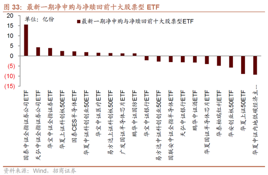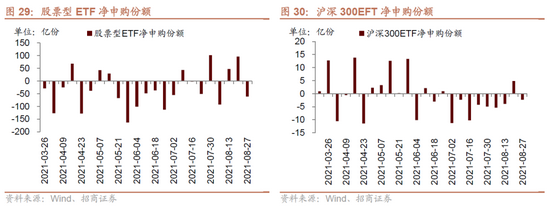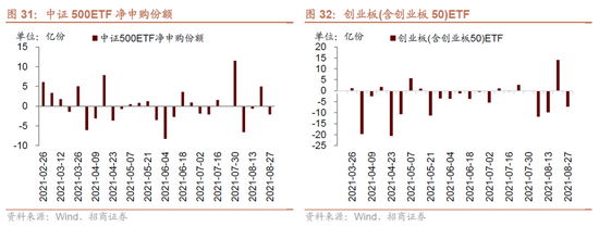 8月23日-8月27日,ETF净赎回,当周净赎回61.4亿份,宽指ETF均为净赎回,其中上证50ETF和创业板ETF赎回较多;行业ETF以净赎回为主,其中新能源&智能汽车ETF大幅赎回,券商ETF大幅申购;具体的,沪深300ETF净赎回2.4亿份;创业板ETF净赎回7.2亿份;中证500ETF净赎回2.1亿份;上证50ETF净赎回8.9亿份。行业方面,信息技术ETF净赎回10.2亿份;消费ETF净赎回4.2亿份;医药ETF净赎回1.5亿份;券商ETF净申购22.1亿份;金融地产ETF净赎回5.1亿份;军工ETF净赎回0.1亿份;原材料ETF净赎回0.6亿份;新能源&智能汽车ETF净赎回25.1亿份。
