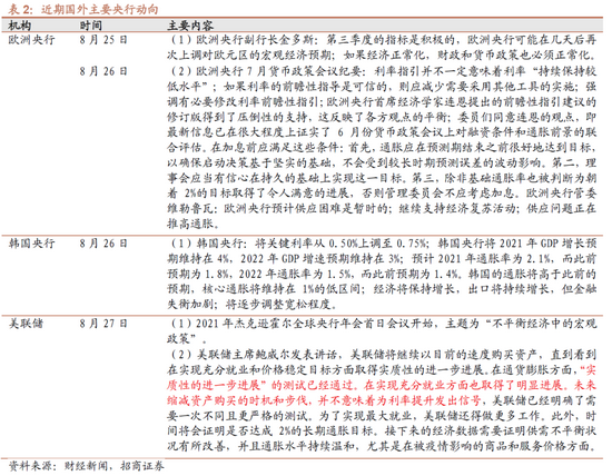 此外上周欧洲央行公布7月货币政策会议纪要:利率指引并不一定意味着利率“持续保持较低水平”;如果利率的前瞻性指导是可信的,则应减少需要采用其他工具的实施;强调有必要修改利率前瞻性指引;并提出了加息应满足的三个条件。韩国央行将关键利率从0.50%上调至0.75%;韩国的通胀将高于此前的预期,核心通胀将维持在1%的低区间;经济将保持增长,出口将持续增长,但金融失衡加剧;将逐步调整宽松程度。