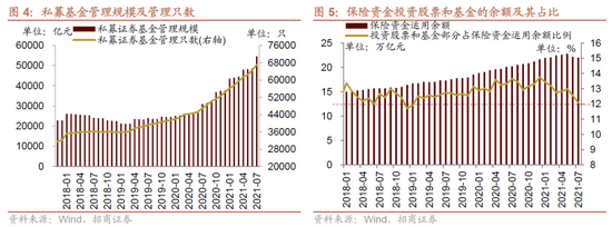 7月私募证券投资基金实现逆势扩张,显示高净值客户的风险偏好仍比较高。截至2021年7月末,私募证券投资基金规模增至5.45万亿,较前一期增加5888亿元,环比增速显著上升,除2021年1月为近三年来单月最大规模增幅。从私募基金的数量来看,在管私募证券投资基金数目 6.7万只,相比6月增加2483只,新增基金数量为近三年最高水平。