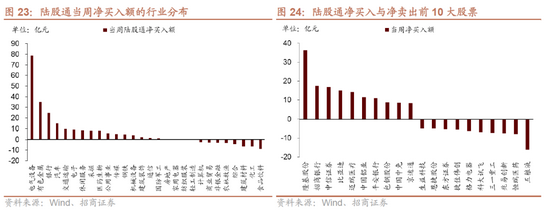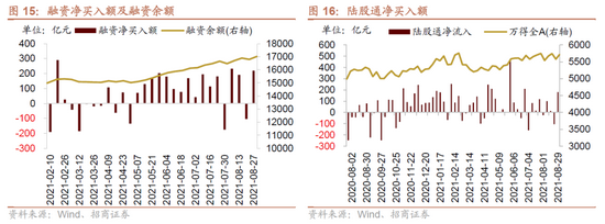8月23日-8月27日,陆股通资金净流入180.0亿元。行业偏好上,电气设备、有色金属、银行这三个行业净买入规模较高,买入金额分别为78.9亿元、35.2亿元、24.9亿元。净卖出规模较高的行业是食品饮料、化工、建筑材料等行业。个股方面,净买入规模较高的主要包括隆基股份(+36.4亿元)、招商银行(+17.4亿元)、中信证券(+16.9亿元)等;净卖出规模较高的主要包括五粮液(-16.1亿元)、恒瑞医药(-7.9亿元)、兆易创新(-7.6亿元)等。