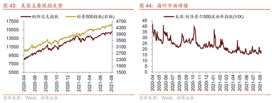 上周VIX指数回落,全周较前期(8月22日)下降2.17点至16.39,市场风险偏好改善。上周美联储主席于杰克逊霍尔全球央行年会上发表讲话,称尽管美国经济在通胀方面已取得充足进展,但就业市场仍待进一步改善,并进一步确认年内开展Taper可能是适合的,基本符合市场预期。鲍威尔强调“未来缩减资产购买的时机和步伐,并不意味着为利率提升发出信号”,此“偏鸽信号”提振三大股指,道琼斯工业指数上涨0.34%,标普500指数上涨0.67%,纳斯达克指数上涨1.25%。