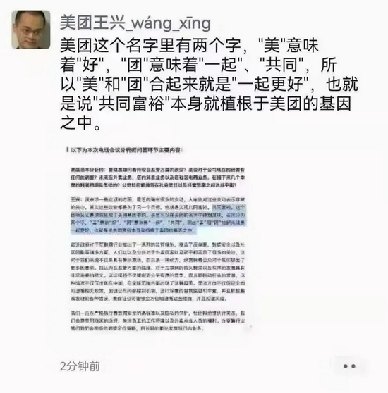 王兴表示,最近宏观和监管层面有很多变动,大家也对这些变动非常关心,但这些改变都是为了实现共同富裕这一个目标。并称“监管变化对于互联网行业的可持续发展和有序增长是利好,也有助于促进公平竞争和行业健康发展”。