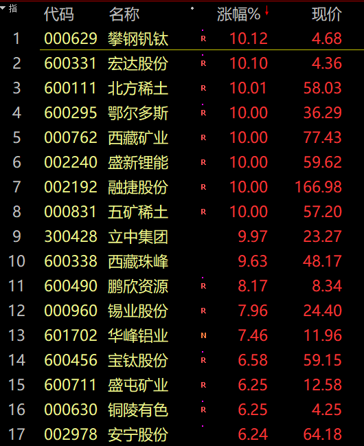 4、钢铁、煤炭、有色、水泥、化工等周期股逆势上涨,锂矿、铁矿、磷矿、稀土等资源股上演涨停潮。
