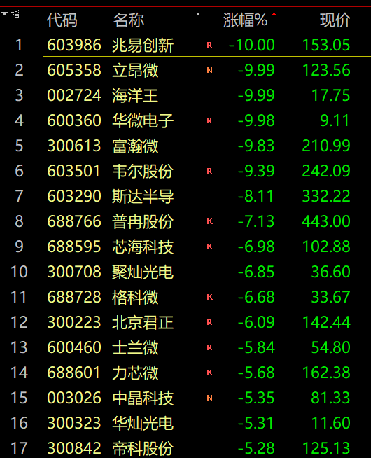 半导体芯片股持续走低,立昂微、兆易创新双双跌停,韦尔股份、北京君正、银河微电、跌超5%。