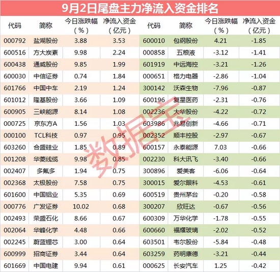 从个股尾盘资金流向数据看,有29股尾盘净流入资金超过5000万元,盐湖股份、方大炭素和通威股份等个股尾盘资金净流入金额最多,分别达3.53亿元、2.24亿元、1.99亿元;包钢股份、五粮液和中远海控等个股尾盘资金净流出金额居前,分别流出1.85亿元、1.41亿元、1.26亿元。