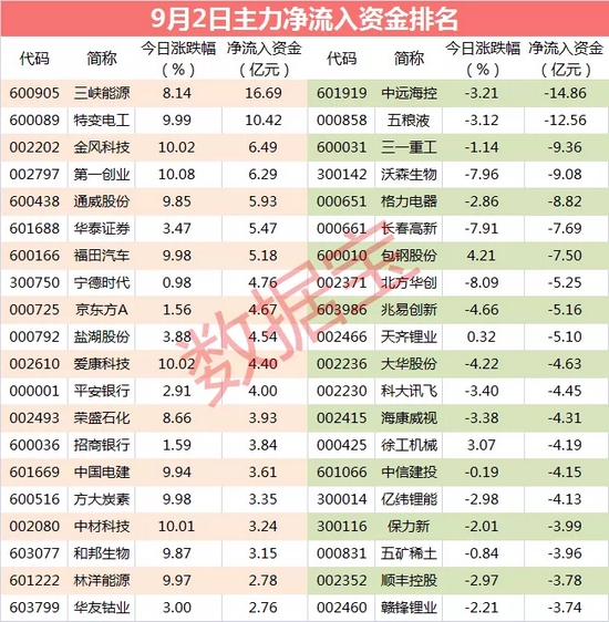 沪指9月2日涨0.84%,深证成指跌0.26%,主力资金全天净流出109.79亿元。其中,创业板主力资金净流出88.14亿元,沪深300成份股主力资金净流出11.43亿元。