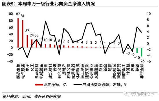 北上资金大幅流入成长板块。本周北上资金主要流入医药生物、电气设备、电子板块,主要流出非银金融、钢铁、汽车板块。