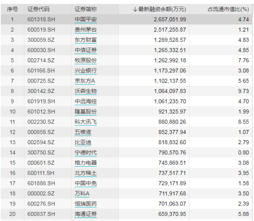 最新融资余额数据显示,融资余额最高的十只个股分别是中国平安(265.71亿元)、贵州茅台(251.73亿元)、东方财富(128.95亿元)、中信证券(126.53亿元)、牧原股份(126.30亿元)、兴业银行(117.33亿元)、京东方A(110.21亿元)、沃森生物(106.41亿元)、中远海控(106.12亿元)、隆基股份(92.13亿元)、科大讯飞(88.09亿元)。