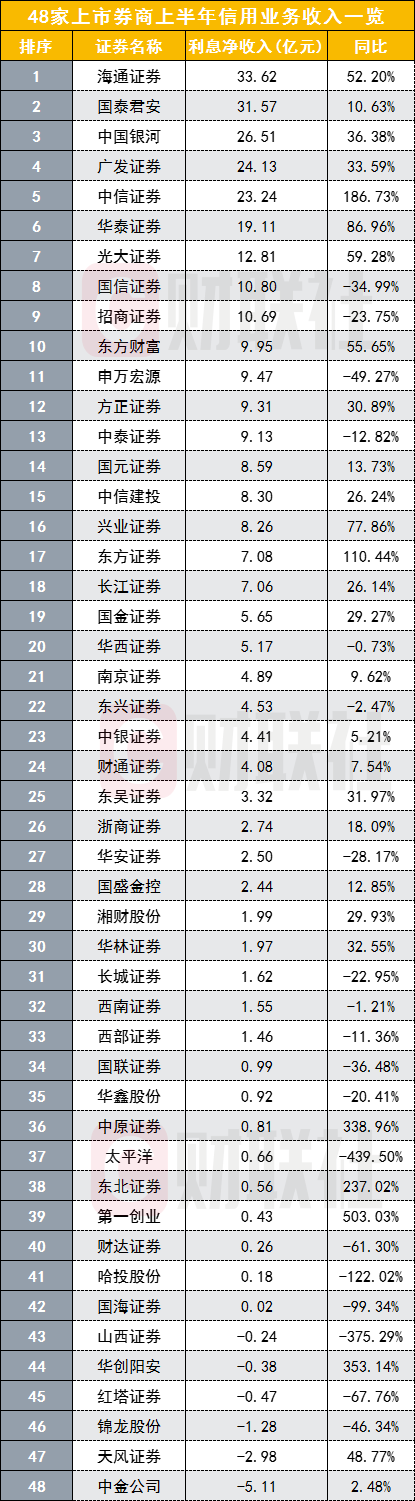 今年上半年,以两融业务为主的信用业务净收入前十上市券商别是海通证券(33.62亿元)、国泰君安(31.57亿元)、中国银河(26.51亿元)、广发证券(24.13亿元)、中信证券(23.24亿元)、华泰证券(19.11亿元)、光大证券(12.81亿元)、国信证券(10.80亿元)、招商证券(10.69亿元)、东方财富(9.95亿元)。