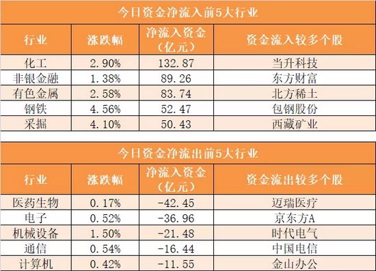 28个申万一级行业中,17个行业实现资金净流入,其中化工行业净流入132.87亿元居首。