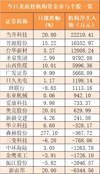 盘后龙虎榜数据显示,机构现身19股,其中当升科技等12股呈现机构资金净买入,新宙邦等7股呈现机构资金净卖出。