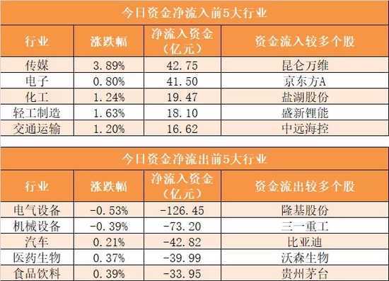28个申万一级行业中,15个行业实现资金净流入,其中传媒行业净流入42.75亿元居首。