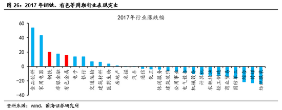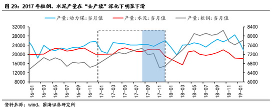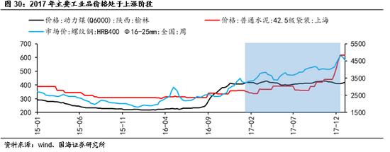 高污染、高能耗产业政策趋严,钢铁、水泥等行业供给收缩明显,相关工业品价格快速上涨。2017年去产能行业范围由钢铁、煤炭向建材、有色、电力等行业扩展,与此同时,环保政策迎来密集出台期。2017年政府工作报告中提到“今年再压减钢铁产能5000万吨左右,退出煤炭产能1.5亿吨以上。”“加大生态环境保护治理力度。报告指出,今年二氧化硫、氮氧化物排放量要分别下降3%,重点地区细颗粒物(PM2.5)浓度明显下降。”随后,环保部分别于2月、4月、5月印发《京津冀及周边地区2017年大气污染防治工作方案》、《重点行业和流域排污许可试点工作方案》、《国家环境保护标准“十三五”发展规划》及《京津及周边地区执行大气污染物特别排放限值的公告》等文件,高能耗高污染产业政策趋严。部分工业产品供给端收缩明显,价格显著上涨。具体来看,2017年Q3起粗钢产量明显收缩,下半年粗钢产量大幅减少10%以上,钢材价格在供给偏紧的背景下一路上涨,全年价格上涨幅度达到48%;水泥产量在Q4进入下行区间,12月单月减产13.2%,全年价格上涨1.2%;动力煤产量在Q4基本确认顶部区间。总的来看,在供给侧改革持续深化及环保政策连续出台之下,部分工业品仍处于压降产能阶段,供给收缩下价格出现明显上涨,助推部分周期行业基本面改善。