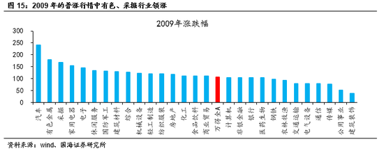 2009年“煤飞色舞”行情再次上演,全方位政策刺激带来的牛市中有色、采掘领涨市场,涨幅主要由估值拉动。本轮牛市开启前,次贷危机席卷全球引发金融体系动荡,A股市场自07年10月以来经历了超过一年的漫长下跌。在“四万亿”天量信贷与各项产业政策刺激下,2009年市场一改颓势持续走强,万得全A全年涨幅达105.47%。风格层面,在09年的普涨行情中,周期风格领涨市场。受益于经济基本面好转带来的需求复苏,中信周期指数全年录得129.95%的超高涨幅,相对大盘超额收益高达24.49%,消费、成长风格也有不俗表现,绝对收益均超110%。行业层面,有色、采掘成为投资端基建地产和消费端汽车家电双重拉动的直接受益行业,全年涨幅分别达180.03%、168.16%,取得了60%以上的相对收益。这一时期,周期行业业绩端改善有限,极为宽松的货币政策释放了大量流动性,估值抬升贡献了绝大部分涨幅。估值来看,有色金属行业估值从年初1.93倍上行至年末5.74倍,涨幅达197.41%,采掘市净率从2.36倍抬升至5.05倍,抬升幅度为113.98%,业绩来看,全部A股净利润同比增速在08年到09年实现了由负转正,但采掘、有色等周期行业业绩增速仍处负区间,未显示出显著的业绩优势。整体来看,在政策强刺激下的普涨行情中,经济V型反转背景下上涨逻辑最强的周期股显著跑赢,估值端的抬升成为有色、采掘等行业上涨的主要动力。