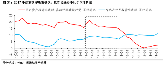 随着基建地产投资失速回落,商品周期同周期股行情基本同时见顶,经济下行担忧下防御属性突出的消费板块成为市场交易主线。2017年经济扩张周期于Q2确立顶部区间,2017年Q3起GDP增速开始放缓。具体来看,固定资产投资增速在2017年3月达到9.5%的阶段性高点后开始回落,随后制造业、基建与地产单月投资增速于Q3失速回落,地产投资同比增速由Q2的3.6%快速下滑至Q3的0.76%,基建增速由Q2的16.85%回落至Q3的15.88%。随着2017年Q2经济顶部区间确立,商品需求拐点的出现导致商品周期于2019年9月见顶回落,与原材料相关的能化指数、金属指数同南华综合指数均于9月进入顶部区域。随后,钢铁、有色等周期股于9月同步确立顶点,表明经济确认顶部区间后,强周期板块的赚钱效应不复存在。但A股并未于9月见顶,此时交易主线由周期板块切换至防御属性更加突出的消费板块,市场赚钱效应仍在。2017年9月至年末,消费板块涨幅为7.5%,同期周期板块下跌5.9%,随着2018年Q1经济完全确立下行走势后市场全面回落。总的来看,经济触及顶部区间是导致本轮周期股行情见顶的核心因素,需求拐点的出现导致商品顶部确立,同期周期行情也步入尾声,市场风格切换至防御性更突出的消费板块。