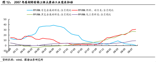 商品价格过热由需求拉动,主要来自于海外需求扩张以及下游地产和基建投资的加速。从主要商品价格来看,2007年南华商品指数涨幅9.3%,其中能化产品显著,达到16.3%,能化产品中主要是煤炭涨价明显,秦皇岛动力煤价格在7月至10月涨幅超过100%。从工业生产者购进价格指数来看,金属类、燃料动力类和化工类原料价格同比自2006年以来开始提速上行,此时全球经济持续自04年以来的共振提升,需求仍在持续扩张,但次贷危机迹象初步显现,有色金属主要受海外定价的铜价大幅上行影响领先其他商品价格先行上涨。黑色金属和燃料动力类价格指数在2007年上行速度最快,工业购进价格指数同比分别由1月的0.4%和4.6%提升至12月的12.1%和15.2%。煤炭、钢铁类原料下游主要来源于地产和基建,国内基建和地产投资累计同比在2007年持续保持在20%以上,建筑安装工程累计同比更是在2007年维持在25%的中枢,国内地产和基建投资需求旺盛驱动原材料价格加速上行。