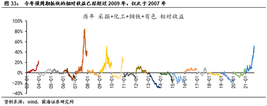 2、今年周期板块行情已经基本演绎至历史之最,无论是同自身的历史表现相比,还是同其它年份涨幅居前的行业相比,超额收益均位居各年份前列。我们统计了2003年以来历年采掘、化工、钢铁、有色四大强周期板块相对万得全A的收益水平,发现今年以来四大强周期板块的最大相对收益已经达到51.8%,远高于2003年、2014年和2017年,同样超过了2009年最高51.5%的相对收益,仅次于2007年大牛市背景下的相对收益水平。由于今年涨幅前四行业分别为钢铁、采掘、有色、化工,我们又统计了2003年以来历年涨幅前四行业相对大盘的收益水平,发现同其它年份相比,今年涨幅前四行业51.8%的相对收益同样位居前列,仅次于2020年的63.0%、2009年的82.8%、2015年的96.3%、2007年的220.6%,表明今年强周期板块的超额收益已经不仅仅是相对自身的历史表现非常优秀,同样不亚于其它年份的上涨主线。总的来看,今年周期板块行情已经基本演绎至历史之最,无论是同自身的历史表现相比,还是同其它年份涨幅居前的行业相比,超额收益均位居各年份前列,后续持续跑赢大盘的空间愈发收窄,性价比优势在逐步降低。