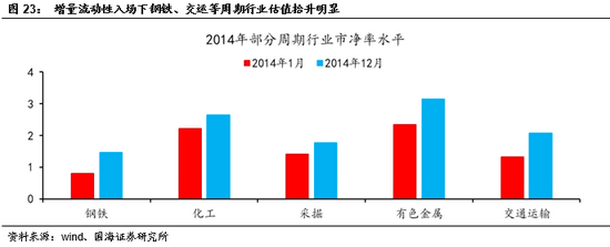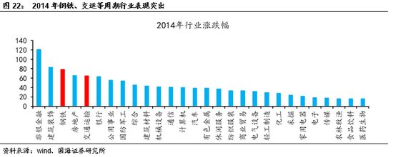 2014年A股市场迎来久违牛市,增量资金入场叠加“一带一路”主题概念持续发酵,钢铁、交运等周期行业表现突出。2014年我国经济下行压力增大,稳增长需求下政策宽松持续加码,叠加“一带一路”主题投资成全年交易重点,交运、钢铁等周期股迎来上涨行情。具体来看,由于在2013年经历了“钱荒式”货币政策,2014年开年市场对流动性宽松的预期较低,尽管在经济下行压力逐步增大下,央行于4月及6月实施了两次定向降准,但仍然未扭转市场的颓势,2014年H1市场维持箱型震荡态势。随着稳增长、稳投资定调打消市场对流动性边际收紧的担忧,2014年5月底市场正式开启一轮牛市,同期流动性持续投放、强改革政策出台叠加“一带一路”主题快速发酵推升经济转型和经济增长的预期,顺周期品种随着市场大涨。2014年万得全A上涨52.44%,建筑装饰、钢铁等周期行业分别实现83.31%、78.34%的绝对收益,相对收益分别达到30.87%、25.90%,交运同样涨幅居前,取得了10%左右的相对收益。这一时期,钢铁等周期板块估值处于历史极低位置,本轮周期行情的本质是增量流动性向低估值板块扩散,估值端的修复为周期股贡献了大部分的涨幅。2014年行情启动前,建筑、钢铁行业PB估值的历史分为数分别为0.5%及0.3%,处于历史绝对低位。2014年钢铁行业估值水平从0.80倍大幅上行至1.47倍,建筑装饰市净率从1.36倍抬升至2.28倍,估值抬升幅度分别达到83.75%、67.65%,成为股价上涨的主要驱动因素。整体来看,经济转型及稳增长预期下建筑装饰、钢铁、交运等周期股迎来上涨行情,估值修复是其取得相对收益的根本动力。