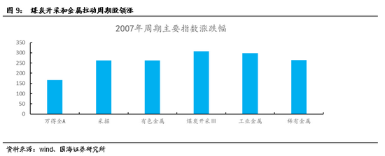 2007年A股市场继续上攻,“煤飞色舞”行情成为主线,涨价逻辑下周期行业估值大幅提升。2007年延续了2006年的普涨行情,万得全A上涨166.2%,涨幅显著超过06年(111.9%),市场情绪持续放大。从走势来看,10月前市场几乎单边上涨,10月后开启结构性行情。全年申万28个行业除了在上一年领涨的银行外,其余行业涨幅均超过100%,其中“煤飞色舞”行情充分演绎,采掘和有色金属成为全年涨幅前二的行业,涨幅分别达到263.2%和262.5%,相对万得全A得超额收益达到97.0%和96.3%。这一时期周期股受益于大宗商品价格快速上行,实现戴维斯双击,估值是主要贡献因子。采掘行业市净率由年初2.27倍提升至年末8.75倍,涨幅达到285.5%,有色行业市净率由年初3.16倍提升至年末达到9.40倍,涨幅达到197.5%。从业绩方面看,采掘和有色行业在2007年ROE分别达到21.3%和20.1%,收益水平同样在申万28个行业中位列前二,而万得全A指数同期ROE为16.8%。从周期具体细分行业来看,采掘行业涨幅主要源于煤炭开采行业拉动。有色金属行业涨幅主要源于工业金属与稀有金属拉动。这两个行业均受益于能化和金属商品价格的大幅上涨。总的来看,普涨行情下,2007年市场主线由06年的大金融切换至周期,涨价逻辑下周期行业估值大幅提升。