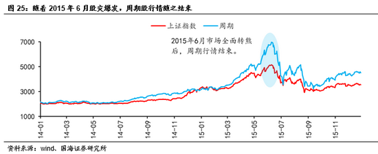 2015年股灾的出现宣告本轮周期行情走向尾声,此后我国经济正式进入转型的深水区,经济增速向下寻底,周期股不再有持续的超额收益出现。2015年上半年市场受国企改革、多层次资本市场体系建设、“互联网+”等多轮改革措施利好下一路上行,上证综指于6月12日站上5178.2点,创下2009年以来历史新高。在市场风格极致演绎的背景下,微观交易结构大幅恶化,市场对利空逐渐敏感。随着6月2日证监会发布《证券公司融资融券管理办法(征求意见稿)》,要求证券公司对外部接入进行自查,清理场外配资,从而引起市场恐慌。随着市场大面积杠杆资金被强行平仓,市场恐慌情绪升级,由2014年开启的“改革牛+杠杆牛”步入尾声,市场全面转熊,周期股行情也不复存在。在随后的一个月内,中信周期风格下跌幅度达到34.7%,钢铁、交运等周期行业下跌幅度均超过20%。