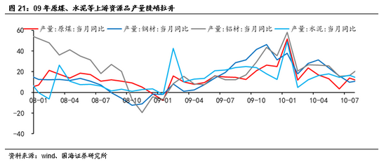 经济复苏阶段上游周期品需求受到基建地产投资和下游消费品需求的双重拉动,供不应求导致其价格一路走高。09年资源股行情主要由需求侧拉动,经济基本面的好转为上游需求提供有力支撑,中国经济率先企稳、全球经济共振复苏的背景下上游资源品成为直接受益板块。一方面,“四万亿”和地产放松政策刺激下,基建投资增速从08年底的22.67%快速拉升至09年12月的42.16%,年内环比提升19个百分点。另一方面,受益于“汽车下乡”的大力财政补贴,09年起汽车销量同比转正,年内销量均保持在100万辆以上,远超08年月均80万辆水平,冰箱、洗衣机等家电销量也从08年底开始了长达1年的增长,进一步强化了对上游的需求。这一时期,上游资源品量价齐升,基建大幅拉升下,焦炭产量同比增速从08年底的-25.00%提升09年底的48.10%,环比增幅达73.10%,钢材、铝材、发电量均实现30%以上的环比提升;动力煤价格冲高,从年初的554元/吨一路上行至767元/吨,环比提升38.45%。总的来看,基建和地产投资的高速增长对资源品形成强力需求拉动,下游家电、汽车等消费品销量高增进一步强化上游需求,上游周期品量价齐升。