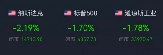 可以看到,周一,美股三大指数集体重挫。截至收盘,道琼斯工业指数跌1.78%,报33970.47点;标普500指数跌1.70%,报4357.73点;纳斯达克指数跌2.19%,报14713.90点;纳指和标普500指数创4个月以来最大单日跌幅。